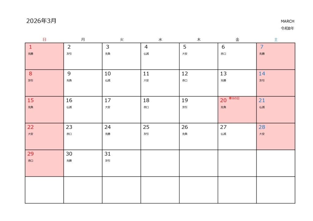 2026年3月営業日カレンダー